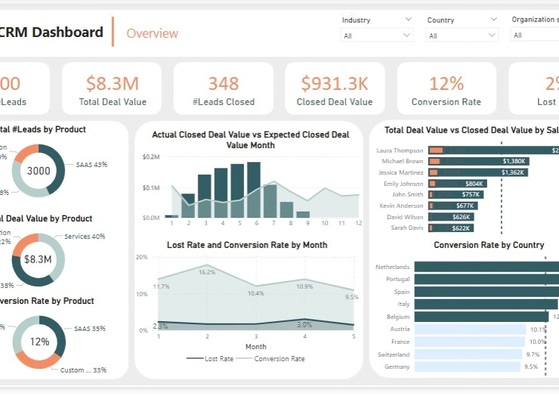 - Track KPIs (total leads, total deal value, leads closed, closed deal value, conversion rate, lost rate.)