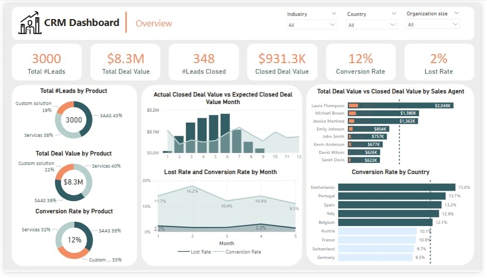 Overview Dashboard: The first report page provides a high-level view of CRM’s overview. We used card visuals to present Key Performance Indicators such as Total Leads, Total Deal Value, # Leads Closed, Closed Deal Value, Conversion Rate and Lost Rate. We also included pie charts to show distribution of total leads, total deal value and conversion rate between products, a line chart to represent monthly lost rate and conversion rate, a line and clustered column chart to compare actual closed deal value and expected closed deal value by month, a clustered bar chart to show comparison between total deal value and closed deal value by sales agent, and a clustered bar chart to display conversion rate by country.