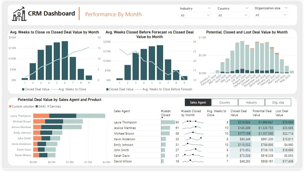 Performance by Month: The second report page is to further analyze the sales agent performance and monthly distribution of closed, expected and potential deal values. It consists of a line and clustered column chart that shows average weeks to close vs closed deal value by month, second line and clustered column chart to display average weeks closed before forecast vs closed deal value by month, a stacked column chart to show potential, closed and lost deal value from January to September 2024, a stacked column chart to display distribution of potential deal value by sales agent and product, and a matrix that visualizes performance of salespersons, countries, industries and organization size in closed leads, average weeks, and closed, potential and lost deal values, with addition of spark lines to display their monthly closed leads.