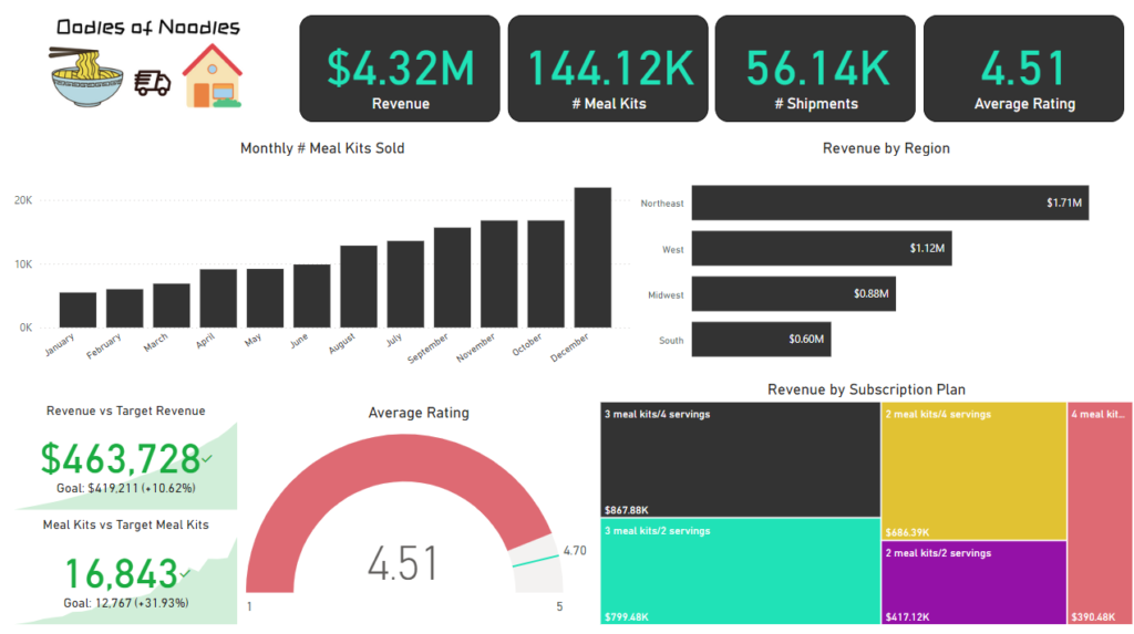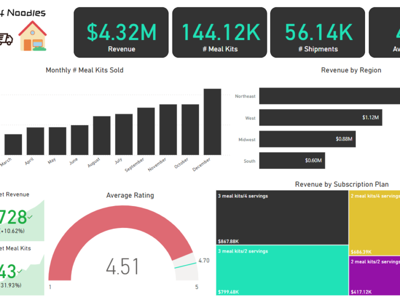 - Track KPIs (revenue, meal kits sold, shipments, customer rating)