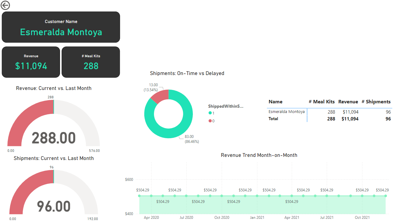 Customer Detail: The fourth and final report page provides deeper insight into customer behavior and value. It uses gauge charts to show revenue comparison for the current and last month and shipments for the current vs last month, a donut chart to show delayed vs on-time delivery to customers, a matrix for the number of meal kits, revenue, and shipments for customers, and a line chart that displays month-on-month revenue.