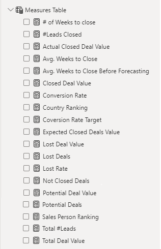 Next, we used Power BI’s front-end formula language, DAX, to analyze our relational data model and create several calculated columns (for filtering) and measures (for aggregation) that we could later reference and use when analyzing and visualizing the data. The list of calculated measures includes avg. weeks to close, # of leads closed, lost deal value, sales person ranking and more.