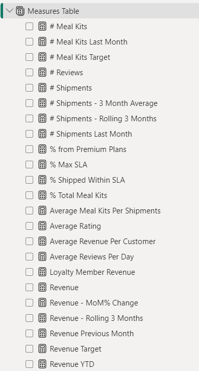 Next, we used Power BI’s front-end formula language, DAX, to analyze our relational data model and create several calculated columns (for filtering) and measures (for aggregation) that we could later reference and use when analyzing and visualizing the data. We used calculated columns to determine whether a customer is active and a loyal member. The list of calculated measures includes key information on revenue, total shipments, reviews, SLA, and more.