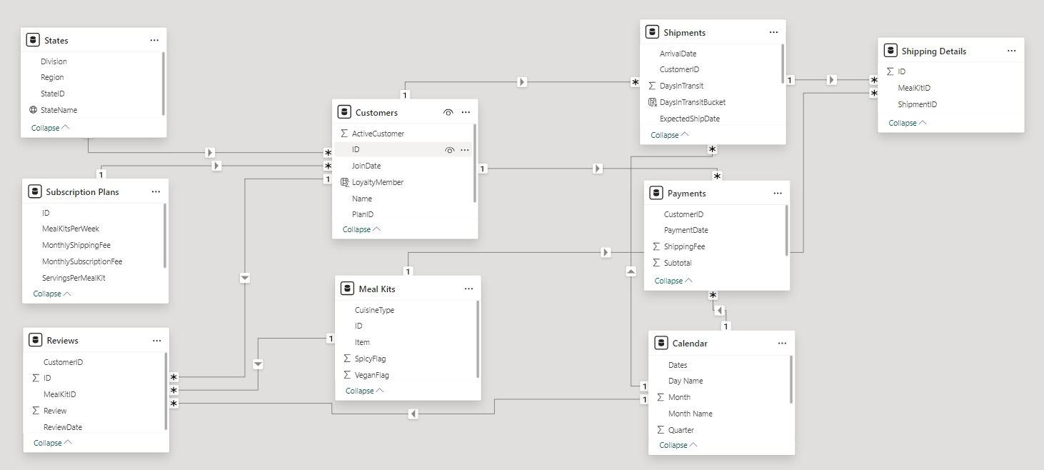 We’ve been given a collection of raw data (CSV files), which contains information about shipments, returns, meal kits, customers, sales territories, and reviews, in a total of 9 tables, from the years 2020-21.