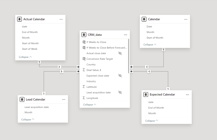 We enabled active or inactive relationships, created hierarchies for fields such as Date (Month-End of Month-Start of Month-Start of Week), and finally hid the foreign keys from the report view to ease the data analysis and visualization steps and reduce errors.