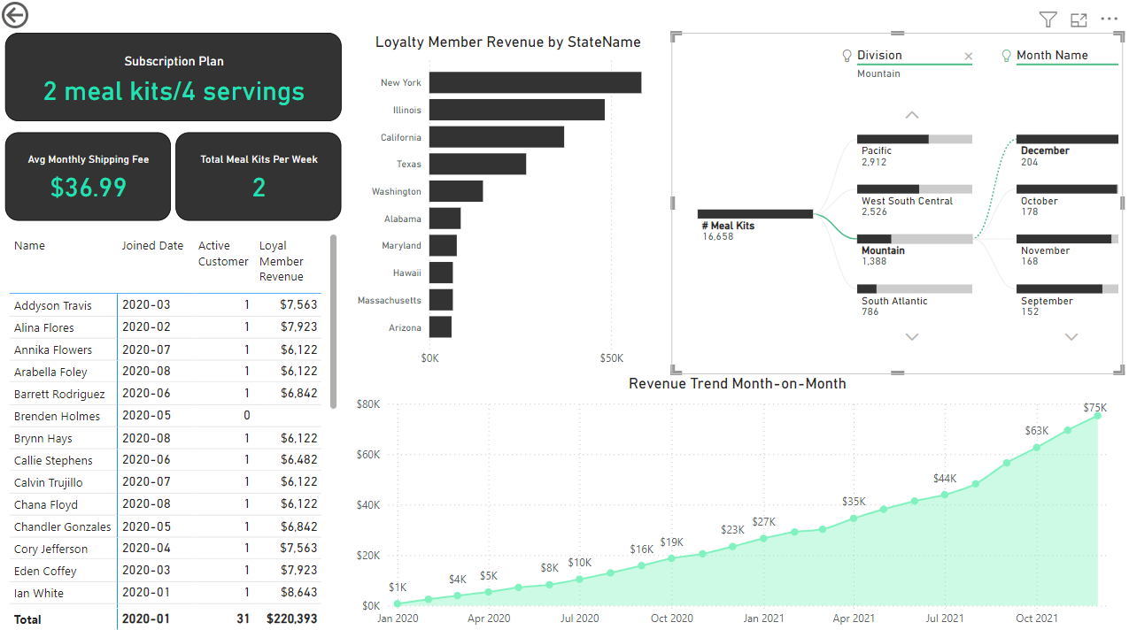 Subscription: The third report page focuses on detailed subscription-level analysis. It displays information such as average monthly shipping fee and total meal kits by subscription plan, a clustered bar chart to visualize loyalty member revenue by state, a matrix that displays the top 30 customers by revenue for the subscription plan, a decomposition tree that displays meal kits by region and month, and a line chart that displays month-on-month revenue trends for the years 2020-2021.