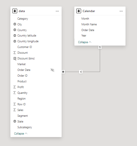 We used calculated columns to categorize discount into defined groups. The list of calculated measures includes key information on sales, customers, orders, profit, quantity, and more.