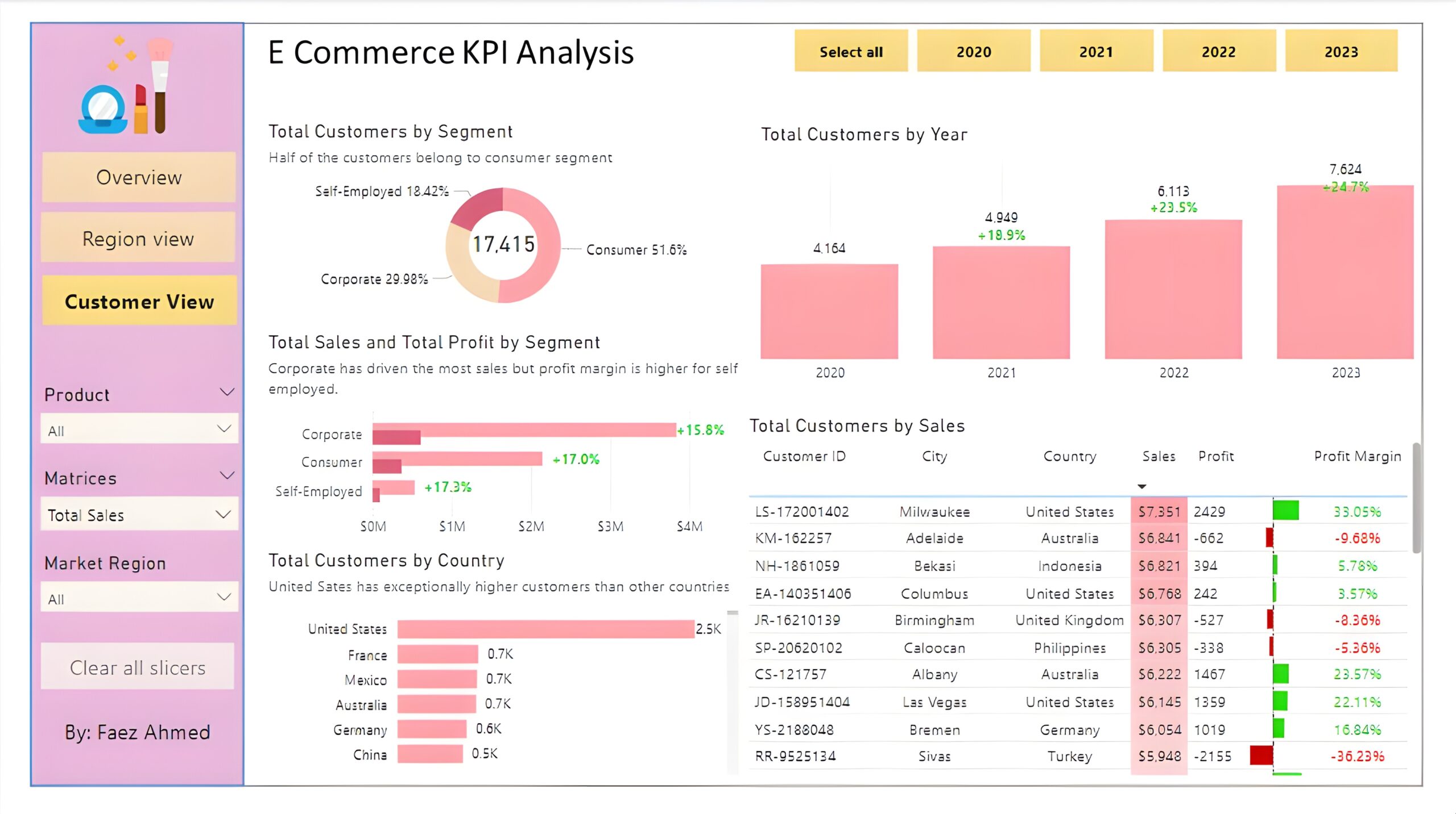 Customer View: The third and final report page provides deeper insight into customer behavior and value. It uses a donut chart to show total customers by segments, a column chart to show total customers by year, a clustered bar chart to display total sales and profit generated by segments, one more bar chart to show total customers by country, and a matrix to present customer’s purchase details, including city and country of order, sales, generated profit and profit margin.