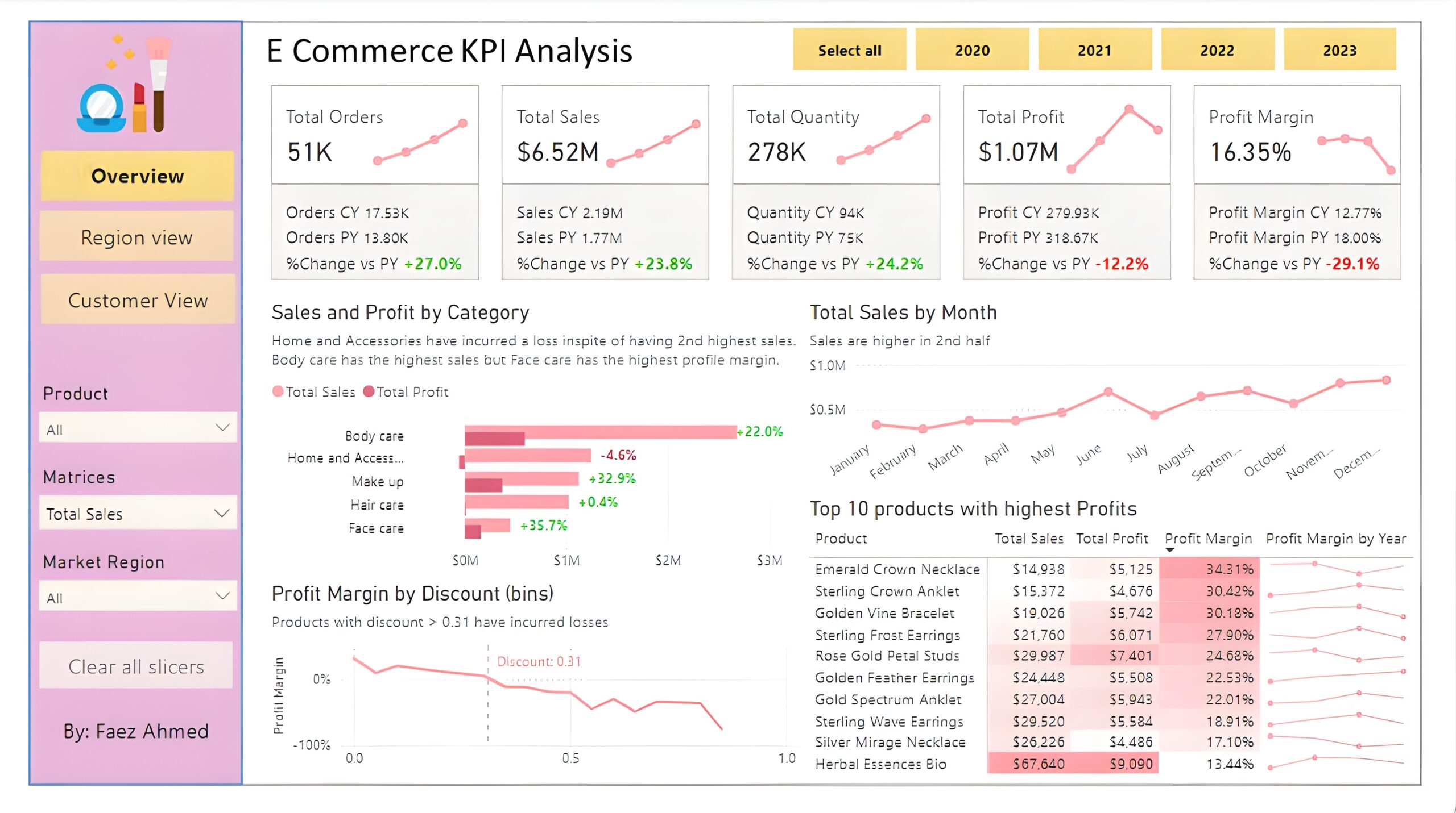 Overview Dashboard: The first report page provides a high-level view of overall performance. We used card visuals to present Key Performance Indicators such as overall sales, number of orders, quantity sold, profit and profit margin. We also included current and previous year performances of those matrices, providing insights into recent trends, a clustered bar chart to show sales and profit by product category, a line chart to display sales monthly trends, another line chart to show profit margin by discount segments, and a matrix to display the top 10 products with their overall sales, profit, profit margin profit margin by year.