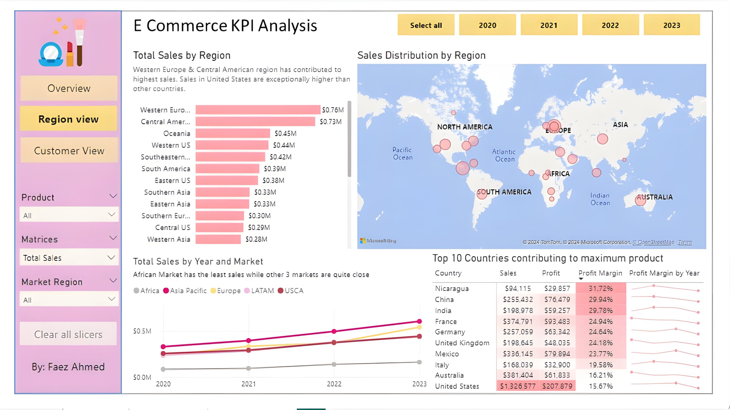 Region View: The second report page is a regional overview page to further analyze the performance in a specific region. It consists of a clustered bar chart that shows sales by regions, a map chart to display sales distribution by regions, a line chart to visualize yearly sales of markets, and a matrix chart that displays top 10 countries with their sales, profit, profit margin and profit margin by year. This offers insight into sales distribution by region.
